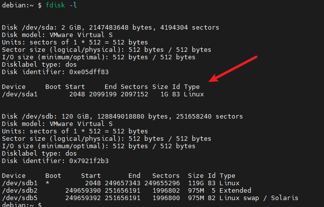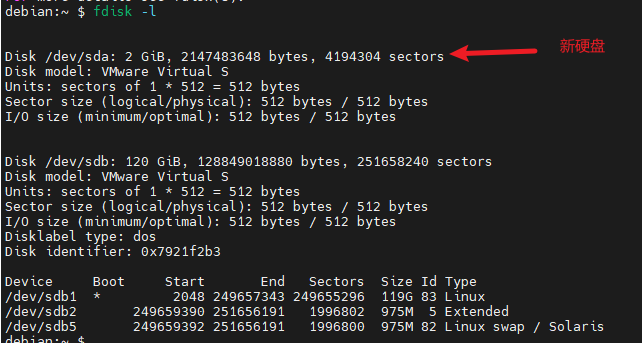 使用 fdisk -l 命令查看所有磁盘,这里的 2G 硬盘(/dev/sda)就是新的