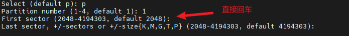 之后选择该分区的起始磁盘数,这里可自定义也可不做选择,如无特殊需求强烈建议选择默认,直接回车