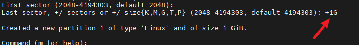 是定义该分区的大小,默认使用整个,直接回车;也可以按照自己的需求进行分配大小。例如这里我分配了 1g 大小。使用 +1G(+1000M,+500G,-20G)