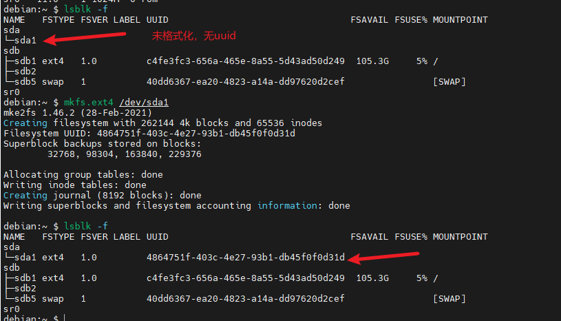 格式化新创建的分区(/dev/sda1)。注意:未格式化,没有显示 uuid