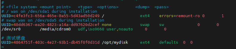 UUID=4864751f-403c-4e27-93b1-db45f0f0d31d /opt/mydisk ext4 defaults 0 0
