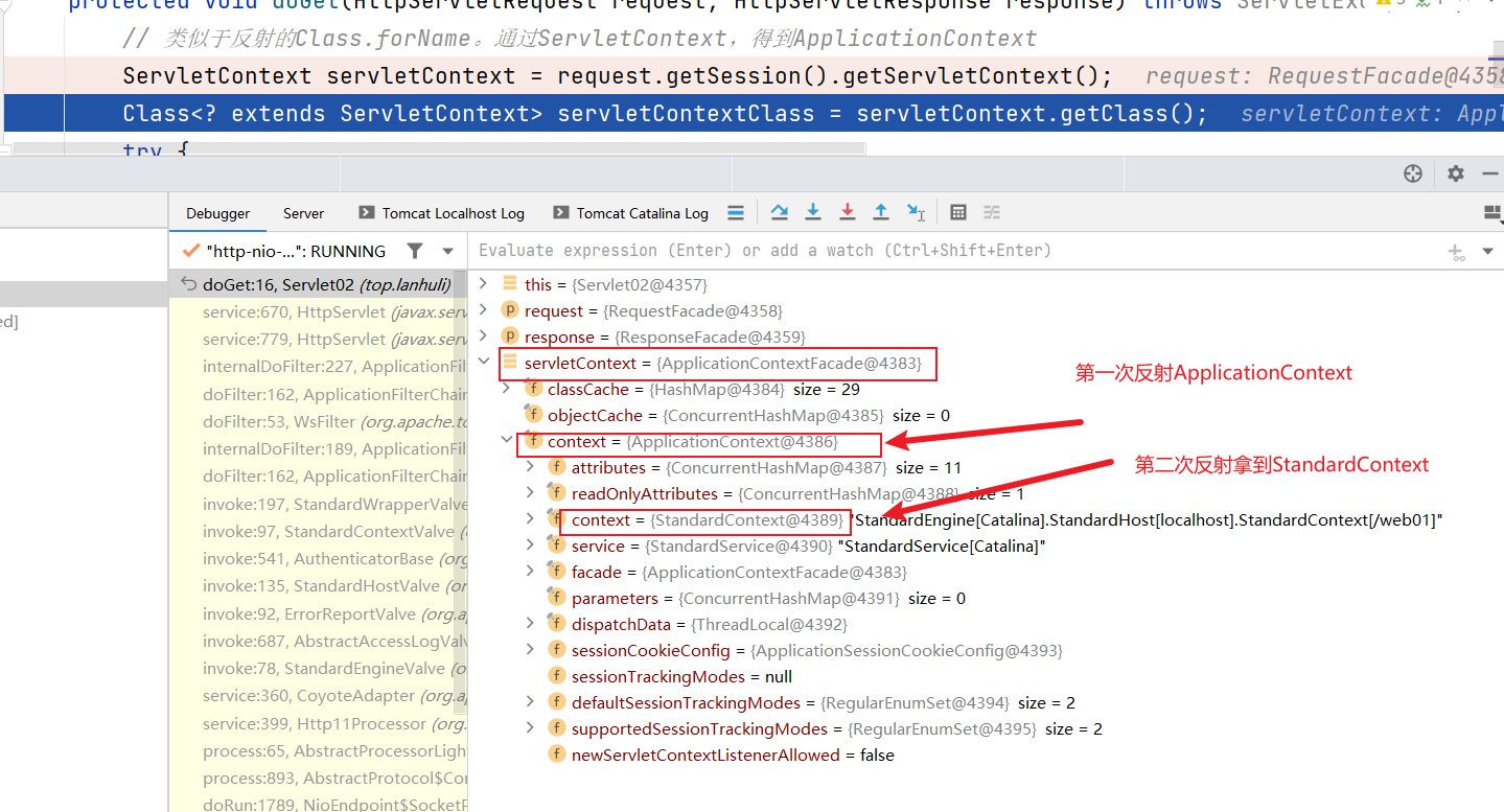 利用反射获取我们想要的对象。第一次反射通过 ServletContext,得到ApplicationContext;第二次反射通过ApplicationContext,得到StandardContext;第三次反射通过StandardContext,得到filterConfigs