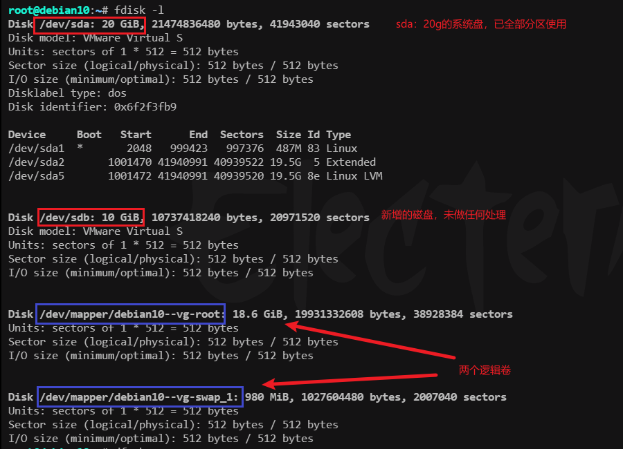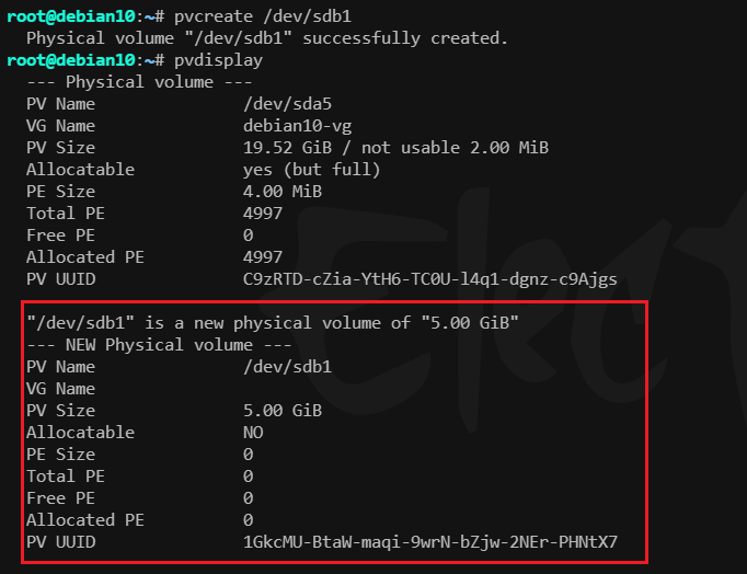 将添加新的物理卷,加载到debian10-vg卷组,使用vgextend debian10-vg /dev/sdb1命令。