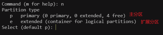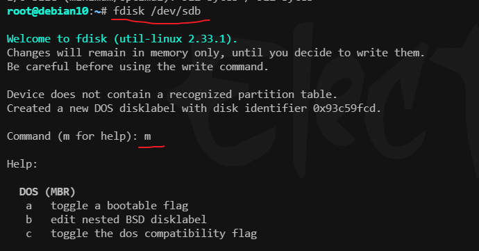 输入fdisk /dev/sdb,回车,然后输入m,回车