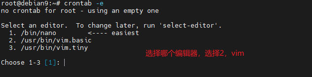 如果输入 crontab -e 提示选择编辑器,选择常用的 vim 即可。如果选择错了,输入 select-editor 重新选择