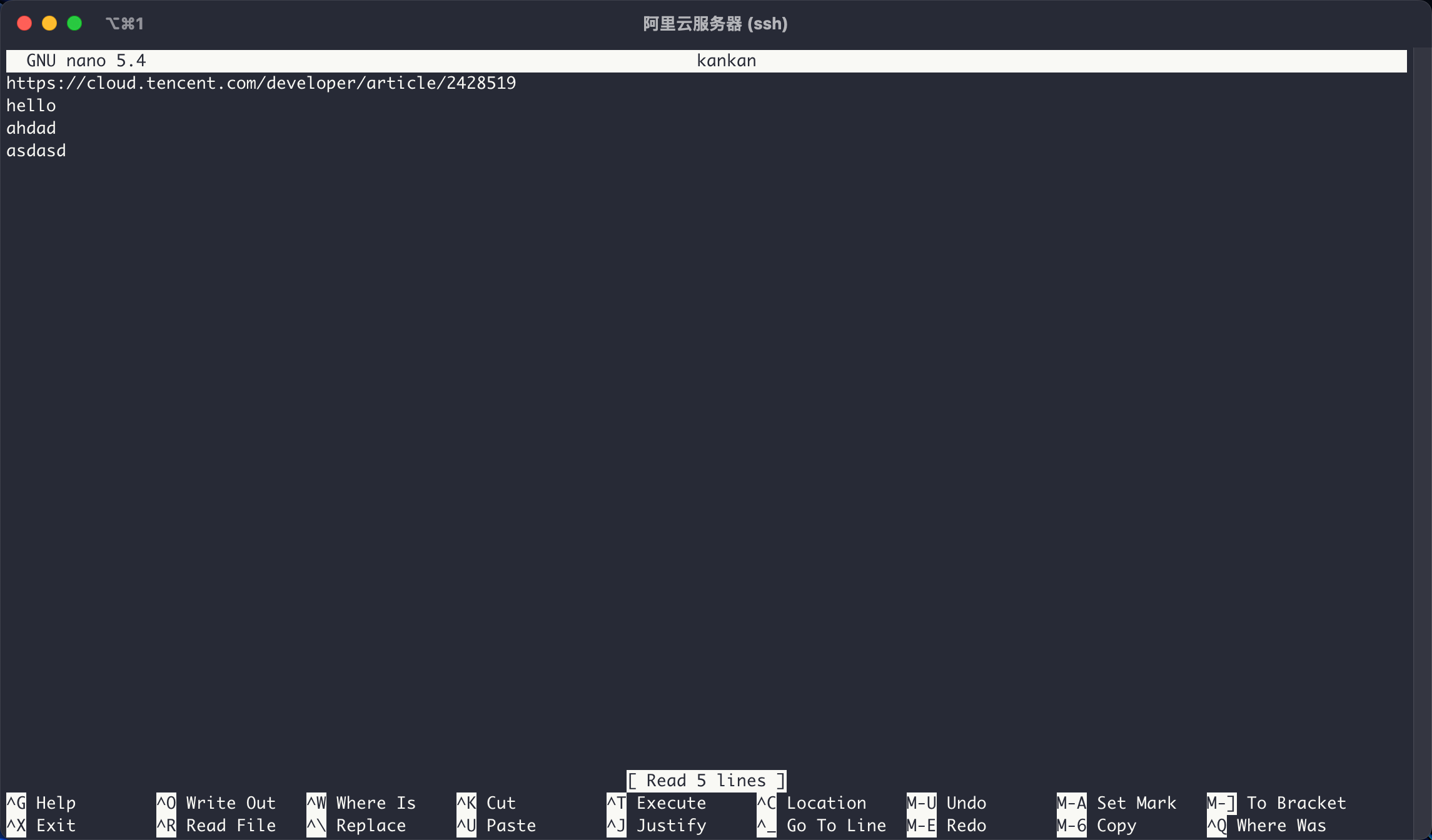 第一行是在声明 nano 的版本和文件名,最下面的三行,分别是文件的状态与两行命令说明。