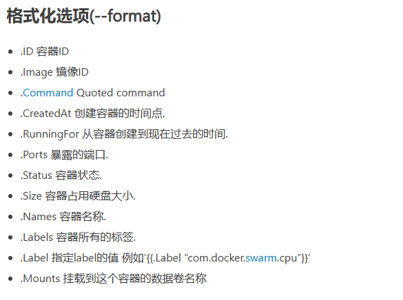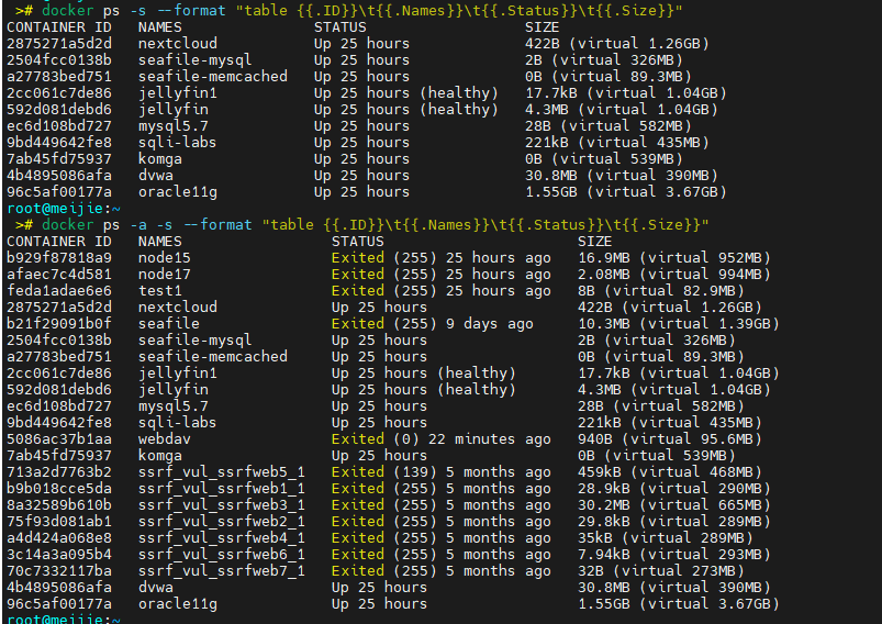 # --format "table {{.ID}}\t{{.Names}}\t{{.Status}}\t{{.Size}}",格式化输出