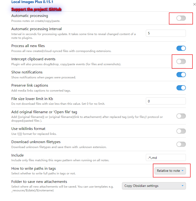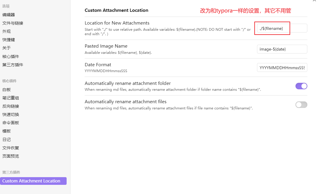 Custom Attachment Location :设置保存图片的路径,可以和 typora 的设置一样。