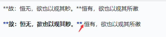 (编者注:在此范例中“故:恒无,欲也以观其眇。”并没有加粗,出现 md 语法失效,群友 D 下列回答了为什么失效的原因)