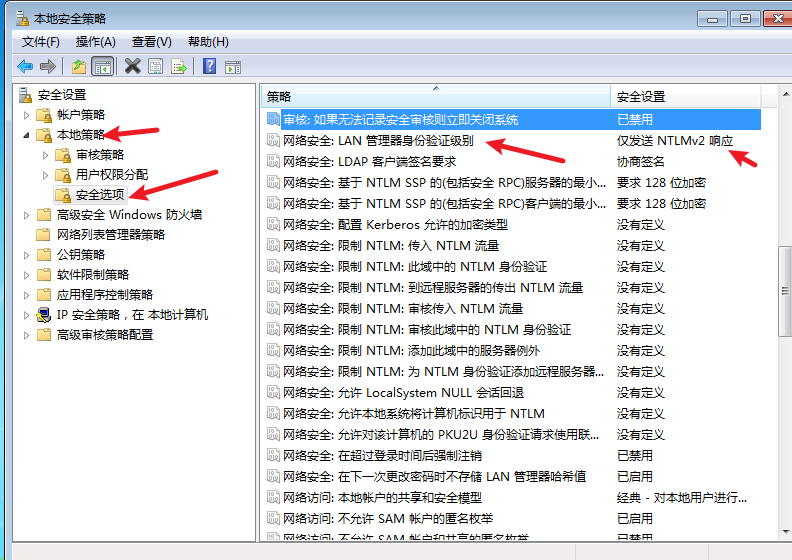 解决方法: 单击“开始”→"运行",输入 secpol.msc 后回车打开“本地安全策略”,在"本地安全策略"中依次打开"本地策略"→"安全选项",然后从右侧列表中找到"网络安全:LAN 管理器身份验证级别",把这个选项的值改为如下所示:多个选项,挨个试试