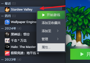 打开 steam,鼠标放置在星露谷游戏上面,点击右键,进入属性