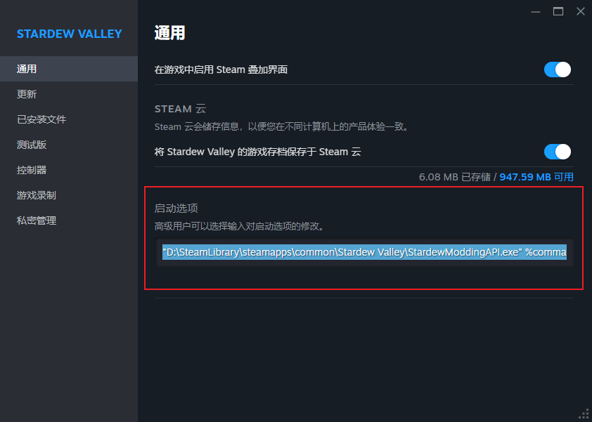 将 SMAPI 的安装路径粘贴到启动选项中,例如我的是 "D:\SteamLibrary\steamapps\common\Stardew Valley\StardewModdingAPI.exe" %command%。注意:双引号不要漏掉。
